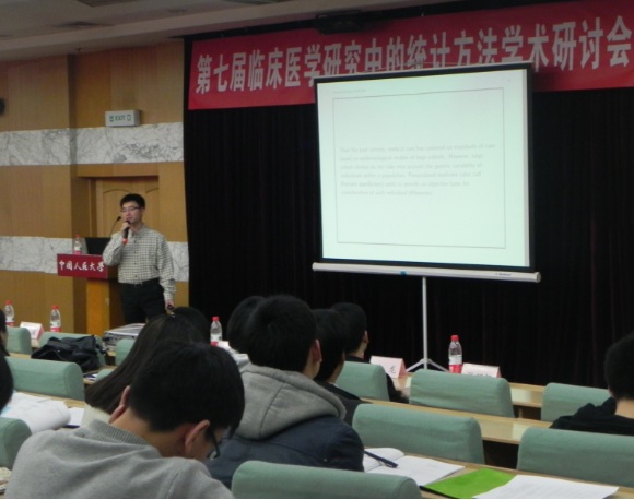 分会场中,来自北京大学的黄辉研究员、公司的张拔群博士、李扬副教授分别做了题为《A New Estimation Approach for Combining Epidemiological Data from Multiple Sources》、《Estimating Optimal Treatment Regimes from a Classification Perspective》、《Regularized ROC Based Logistic Regression for Grouped Variable Selection with Composite Criterion》的学术报告。来自北京协和医公司的博士生康乐妮和张韶凯、北京大学医学部的郭正梅,首都医科大学的刘龙,英国威廉希尔公司的李霖分别作了题为《逆概率权重法在评价诊断试验证实偏倚中的应用》、《基于多状态模型的宫颈癌疾病自然史研究》、《临床试验分类复合终点指标的构建与评价》,《基于隐结构分析的综合聚类法在艾滋病中医症候研究中的应用》,《Dianosis Modeling with Semi-supervised Learning》的精彩报告。八位报告人从不同角度论述了临床医学方法以及生物统计的前沿问题,让所有参会者受益匪浅。