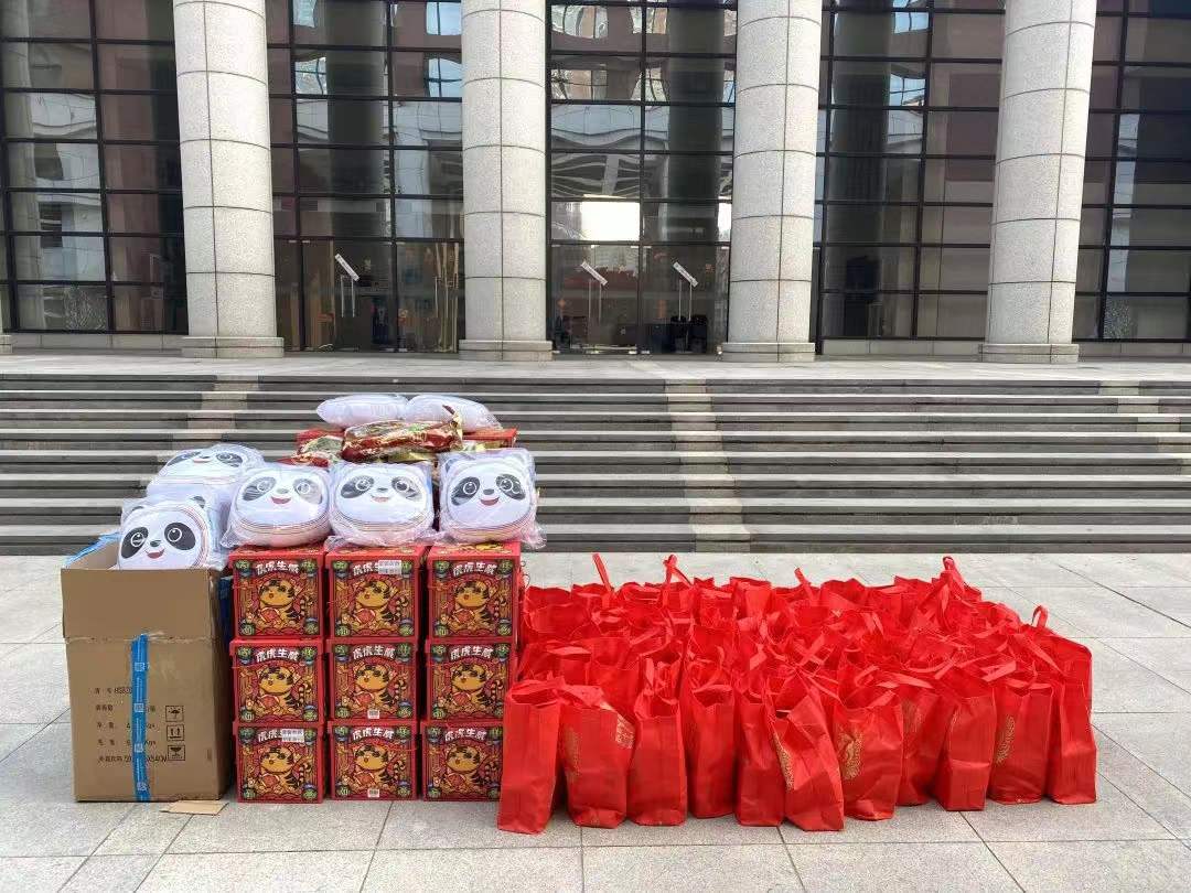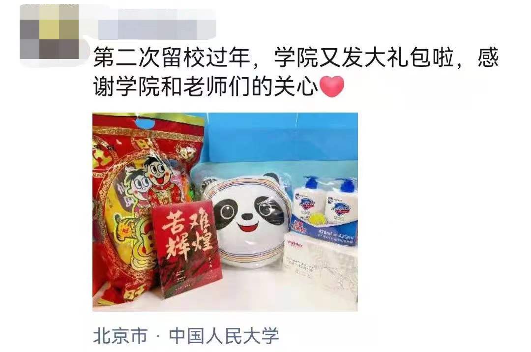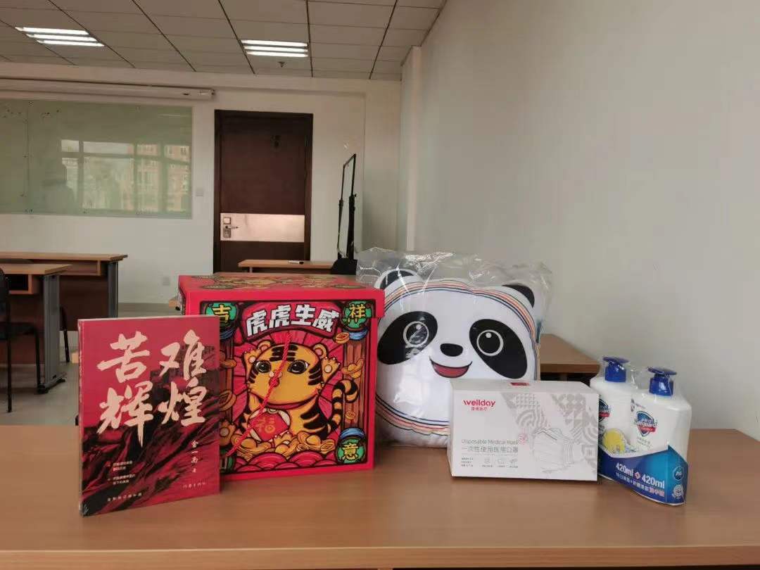 公司领导关切地询问了同学们的留校原因与生活情况,叮嘱同学们做好疫情防护,注意用电安全与防火防盗。在场领导一同为留校员工分发了新春大礼包,内含冬奥吉祥物冰墩墩抱枕、整箱零食、消毒洗手液、医用口罩、图书《苦难辉煌》等精美礼品,兼具生活关怀与精神引领,帮助同学们在校园中度过温暖而有意义的新年。同学们表示将严格遵守公司、公司管理要求,共同维护校园安全,并纷纷在朋友圈表达感谢与祝福。