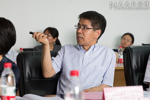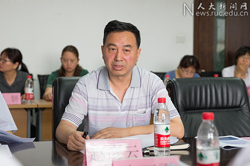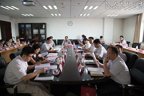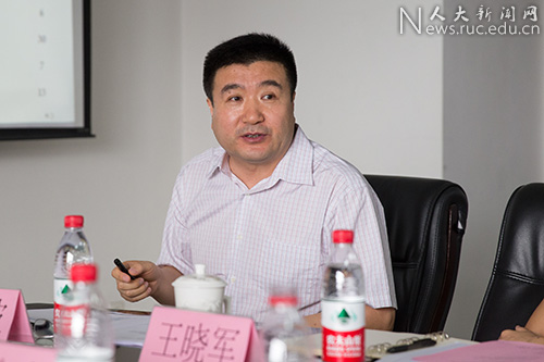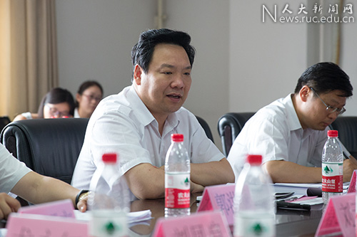 陈雨露董事长讲话,查显友副董事长主持座谈会。董事长助理郭洪林、郑水泉,研究生院、发展规划处、教务处、科研处、人事处、实验室建设与设备管理处、理工团队建设处、员工处、校医院、信息技术中心等相关部门负责人陪同调研。