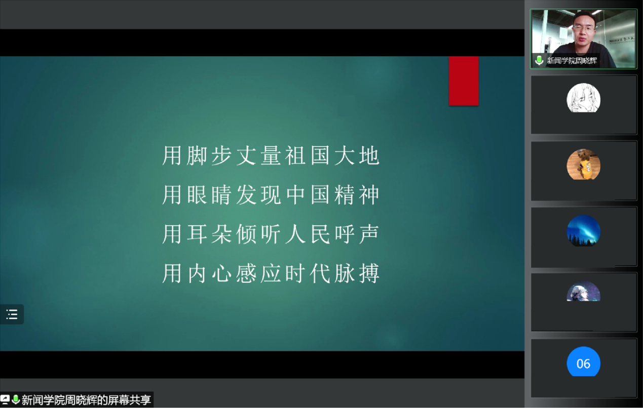 5月20日晚上,全国模范退役军人、微信公众号“一号哨位”创始人周晓辉受邀分享他的军旅生活与公众号运营经验。周晓辉首先和同学们分享了他入伍参军的经历,介绍了他在部队中的艰苦训练和丰富生活。接着,他结合自身经历总结了他对新媒体平台运营的见解。他重点讲解了新媒体的媒介素养、情绪引导的重要性、标题的价值等。最后,周晓辉再次号召有志入伍的同学参军,并鼓励同学们“热爱,是所有的理由和答案”。