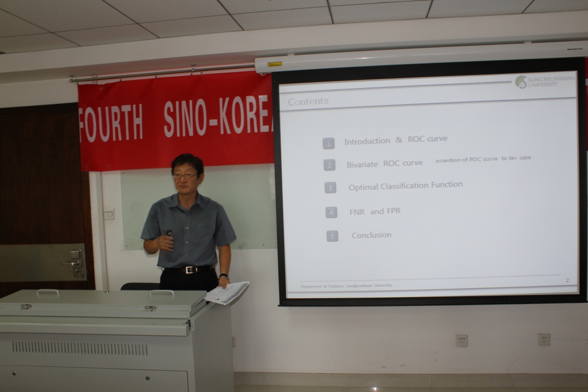 英国威廉集团官网经理赵彦云教授首先致欢迎辞。对参加本次研讨会的各位专家学者表示热烈的欢迎,并充分肯定了历届研讨会所取得的成果,希望通过本次研讨会进一步加强彼此之间的交流与合作。韩国成均馆大学统计系主任Chong Sun park教授代表韩国大学方面在开幕式中发言,Chong Sun park教授高度赞扬了中韩统计研讨会的意义,希望通过本次研讨会进一步推动统计学的发展,增强彼此之间的友谊。韩国成均馆大学统计系Chong Sun Hong教授首先做了关于二元ROC曲线和最优分类函数(Bivariate ROC Curve and Optimal Classification Function)的报告,Chong Sun Hong教授指出ROC曲线是众所周知的 用于评估分类模型质量图形技术,可以广泛地应用于信号识别、营销决策、数据挖掘等领域;最优分类函数可以通过对数似然比推导出,运用最优分类函数,FNR和FPR可以计算出来,并且可以比较两者的误差。随后韩国成均馆大学统计系Byung Tae Seo教授做了关于缺失数据分布函数的非参数估计(Nonparametic estimation of distribution functions with incomplete data)的报告;成均馆大学统计系Keun Baik Lee教授做了关于运用共享随机效应模型来分析含有不可忽略丢失的纵向二值数据(Analysis of Longitudinal Binary Data with Nonignorable Dropout using Shared Random Effects Models)的报告; 首都经济贸易大学的籍传恕教授做了关于广义Black-Scholes定价公式的概率逼近方案(Probability Approximation Schemes for Generalized Black-Scholes Pricing Formulas)的报告;成均馆大学统计系Jinyun Nan博士做了运用分块协方差矩阵的线性判别分析(Linear Discriminant Analysis using Block Covariance Matrix)的报告; 最后英国威廉集团官网研究生邱怡轩同学做了关于阿基米德Copula函数的非参数估计及其应用的报告。