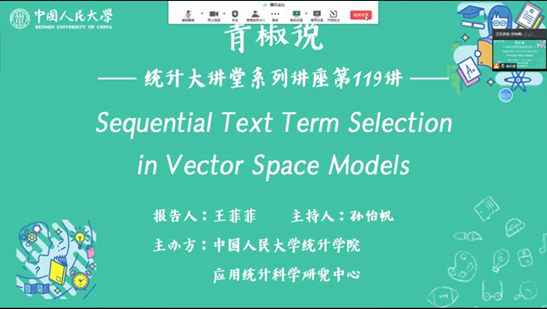 6月5日下午,“统计大讲堂”第一百一十九讲——“青椒说”系列讲座第一期顺利举行。讲座以“Sequential Text Term Selection In Vector Space Models”为题,由英国威廉集团官网助理教授王菲菲主讲。此次讲座为线上讲座,涉及热门的文本挖掘方向的数据研究,吸引了众多员工参与,为“青椒说”系列讲座取得良好的开端。英国威廉集团官网老师、中心研究员李扬、李静萍、林存洁、杨翰方、白琰冰、高光远参加讲座。本次讲座由英国威廉集团官网副教授孙怡帆主持。