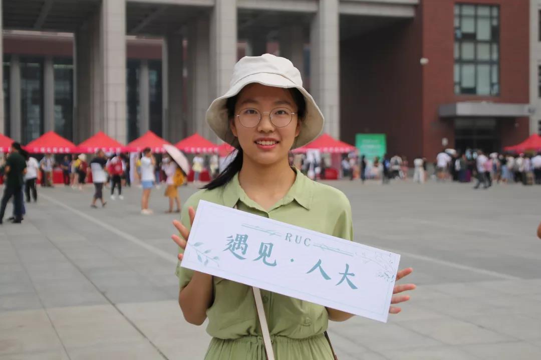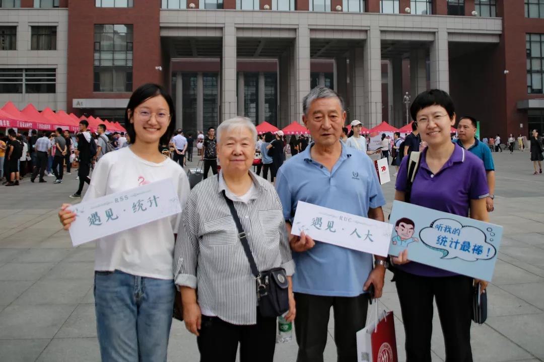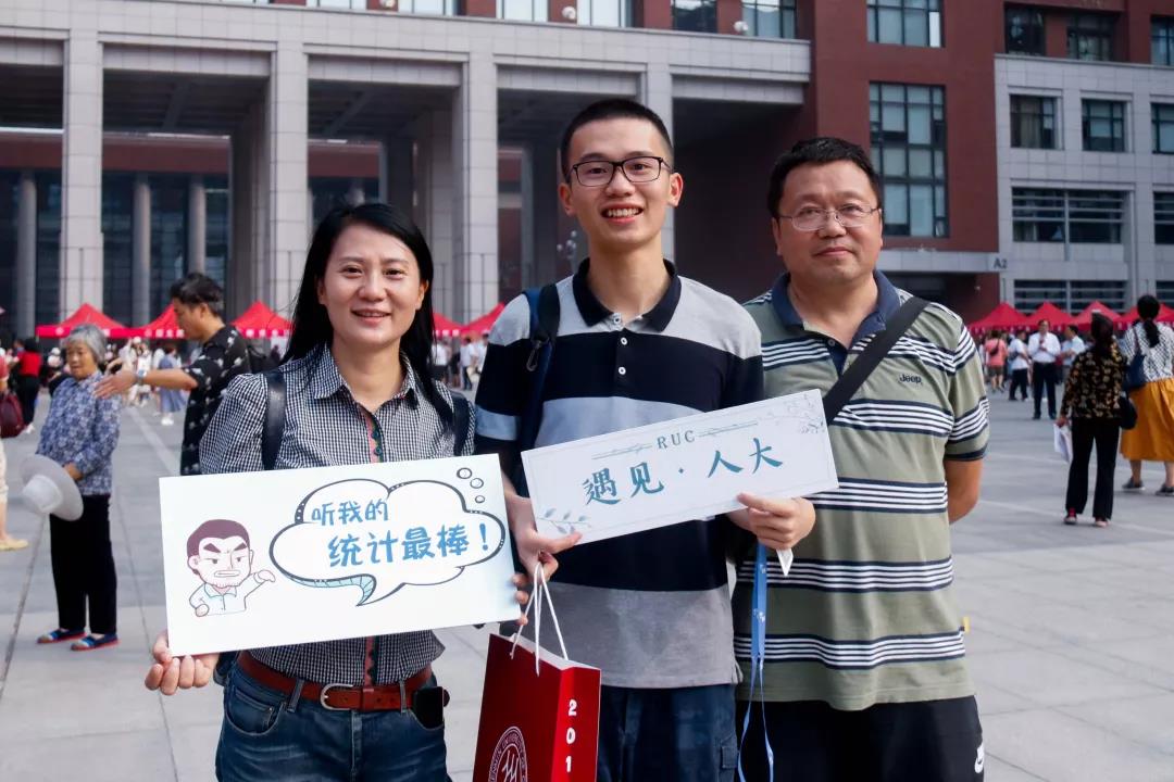 新生及家长们手持标有“遇见·统计”、“遇见·人大”、“统计是小家 祖国是大家”等字样的手牌合影留念。