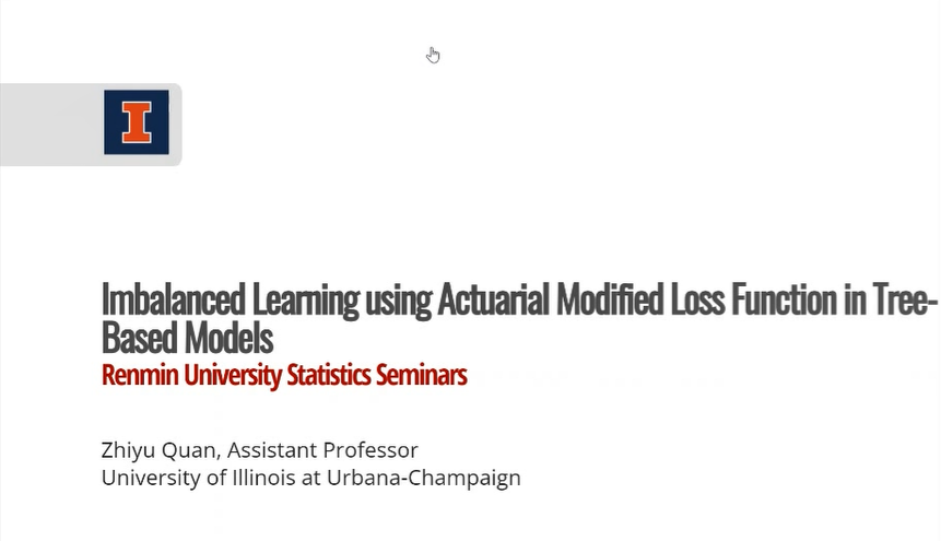 高光远首先介绍了主讲人的相关信息。Zhiyu Quan是伊利诺伊大学香槟分校数学公司助理教授,持有康涅狄格大学的精算学博士学位。在加入伊利诺伊大学之前,他曾在一家顶尖的保险科技公司担任研发数据科学家,为大型保险公司开发数据解决方案。他在数据科学应用方面有广泛的研究兴趣,如决策树模型、自然语言处理、深度学习,他应用精算专业知识建立预测模型,用于理赔研究、费率制定等。他的研究项目由真实数据驱动,灵感来自于与保险科技公司和传统保险公司的合作。此外,他还是伊利诺伊风险实验室(IRisk Lab)的指导教师,该实验室促进将学术研究与实际商业问题结合的研究活动。近期他获得了Arnold O. Beckman Research Award。