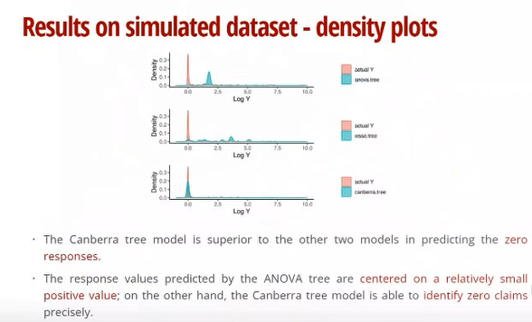 为检测不同损失函数下模型的预测效果,Zhiyu Quan对于基于不同损失函数的决策树分别进行了实例检验和模拟数据集检验。在实例检验中发现WSSE决策树和Canberra决策树模型在分离非零变量和零变量的效果上优于传统ANOVA决策树。在模拟数据集检验中发现Canberra模型预测效果最佳。
