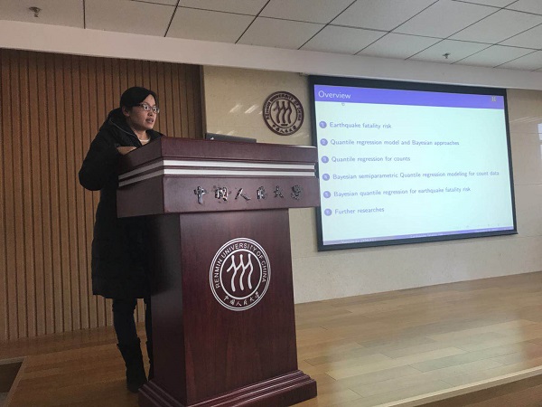 李云仙副教授的报告题目为:Bayesian Semiparameteric Quantile Regression Modeling for Estimating Earthquake Fatality Risk。李云仙副教授讲到统计学中常用的均值回归模型对于有极端值的情形不够稳健,而地震死亡人数是大量取值为零,过离散,且存在极端值的计数变量,均值回归模型不再适用于分析地震死亡人数。李云仙副教授提出半参数贝叶斯统计方法对平滑化后的死亡人数建立了层次模型,假设随机误差项服从混合非对称拉普拉斯分布,并基于Dirichlet过程构建混合分布。在地震灾害死亡人数的分析中,分别拟合了参数模型和半参数模型,并基于Lv测度对模型进行比较,发现半参数模型拟合效果优于参数模型。实证分析结果也显示,基于半参数模型所得到的误差项尾部更厚,能够更好的反应真实情况。受数据获取难度所限,模型中仅考虑了地震震级和人口居住密度作为解释变量。另外,在巨灾保险中,巨灾风险是人们更为关注的一个问题,在分位数回归拟合中,主要考虑了对地震死亡人数高分位数(90%~99%)的拟合情况。