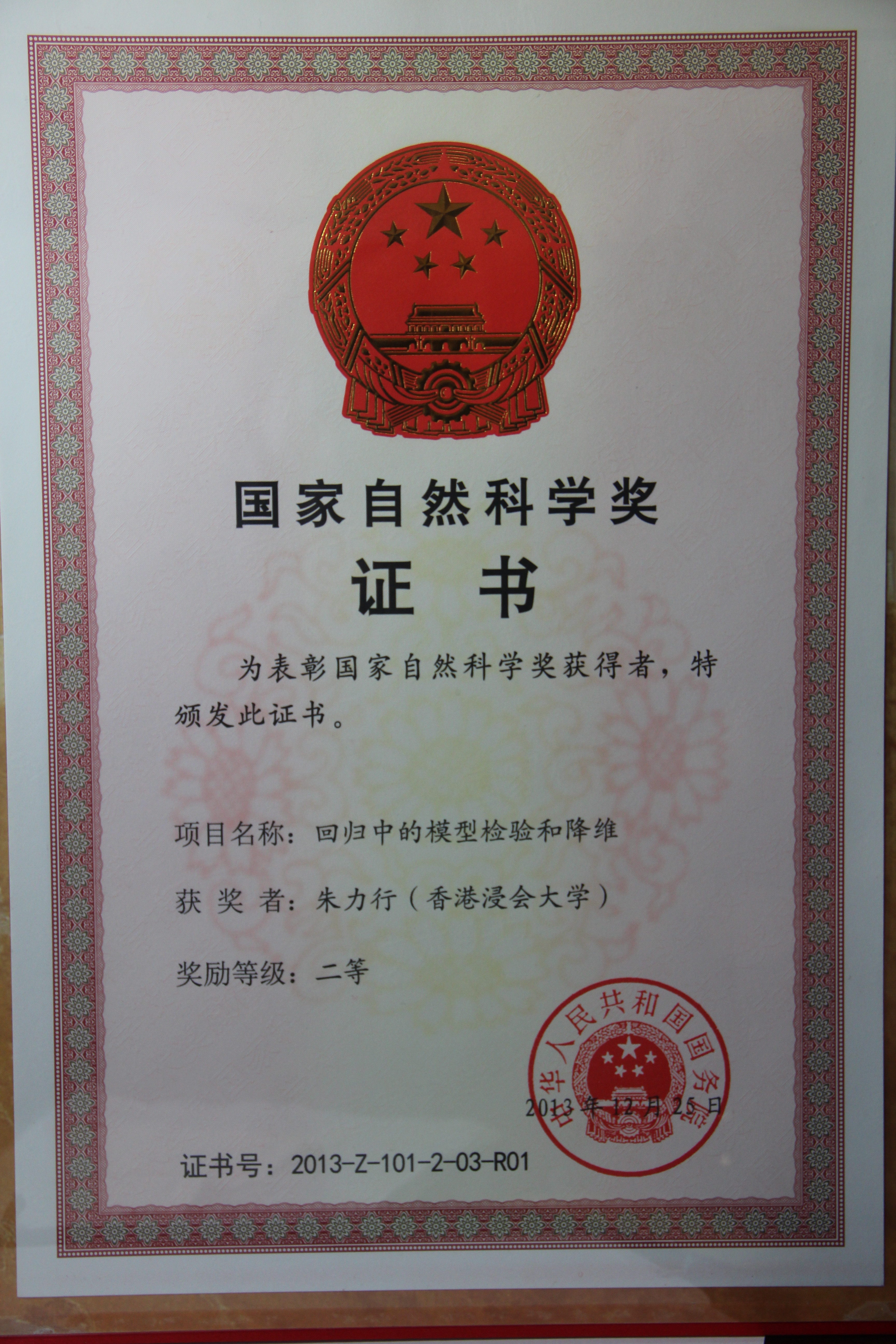 “2013年度国家科学技术奖励大会”已于2014年1月10日召开,这是党的十八大、十八届三中全会后科技界一大盛事。香港浸会大学讲座教授朱力行作为唯一完成人的项目“回归中的模型检验与降维”获得国家自然科学奖二等奖。