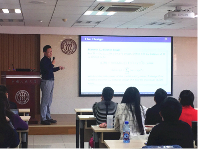 孙法省博士的报告题目是:Uniform Projection Designs. 随着计算机技术的发展,许多试验可以通过计算机来模拟,这样不仅可以节省费用而且可以加快研究进程。模拟点(也称设计点)的选取直接影响后续估计和建模的好坏。常用选择设计点的三个准则为(1)低相关性;(2)最大最小距离;(3)空间填充性。根据这三个准则可以构建试验点,同时这三个准则也可以作为评价一个设计好坏的准则。孙法省博士发现根据这三个准则,当一个设计在高维空间表现良好时,在其低维子空间表现不一定好。但是在建立模型时,低阶效应应该给予更高的重视。基于最小化试验点投影在其所有一维和二维子空间的距离这一新的准则,孙法省博士提出了均匀投影设计。该设计不但在设计点的低维子空间具有很好的表现,且在上述三个准则下都表现良好,具有稳健性。在报告过程中以及报告结束后,在场师生就子空间维数选择、设计变量与反应变量间的线性关系假定等问题与孙法省博士进行了讨论。