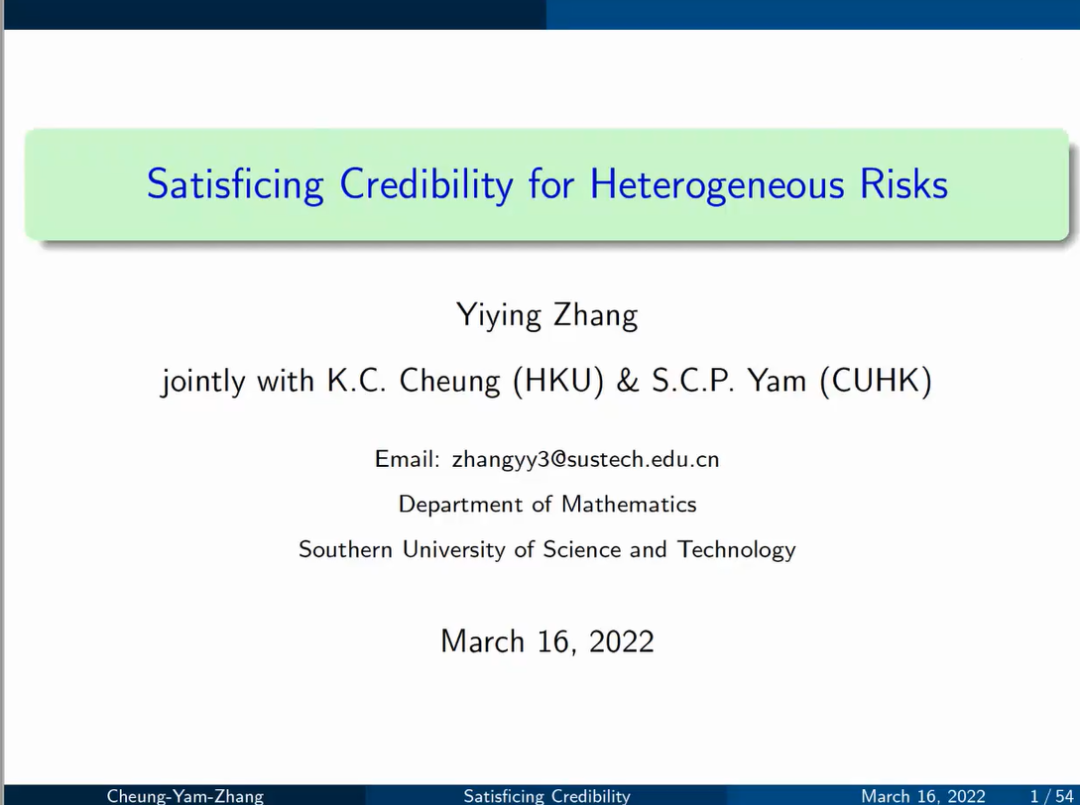 3月16日上午,“统计大讲堂”系列讲座第186讲举行。本次讲座采取线上会议的方式,邀请南方科技大学数学系助理教授张艺赢作题为“基于非齐次风险的满意信度理论方法”的报告。讲座由英国威廉集团官网副教授高光远主持。