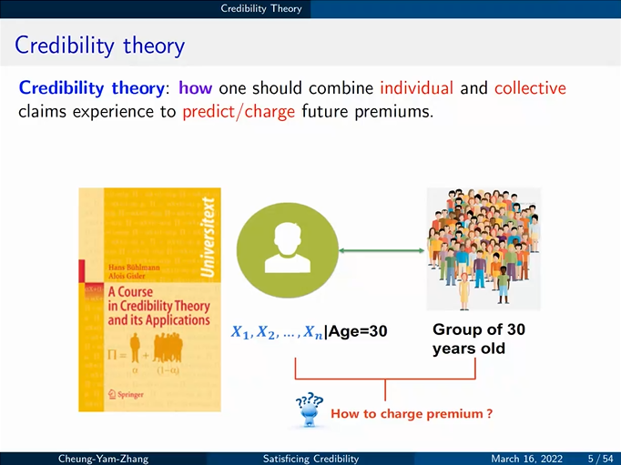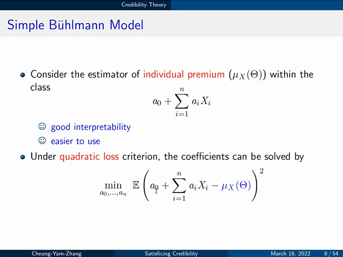 虽然贝叶斯框架在理论上十分完善,但是实际应用时的效果受后验概率选取的影响较大,所以Bühlmann提出了一种逼近个体溢价的优化方法,构造了Simple Bühlmann Model。在详细解释该模型的原理后,张艺赢介绍了近十年内以Simple Bühlmann Model为基础,对目标函数进行改变的研究成果。同时,他指出该模型对异常值有高度敏感性,所以稳健性较低。