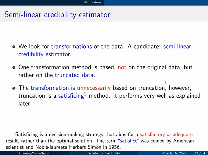 为了解决上述缺点,De Vylder首先提出对观测值进行截断形式的数据转换的方法,Gisler后来也进一步指出,L2最优截断点的选取可以通过一种特殊的方式确定,但其显式公式的推导十分困难,而且并未推广至半连续数据和连续数据上,这也是张艺赢所在团队的研究背景。