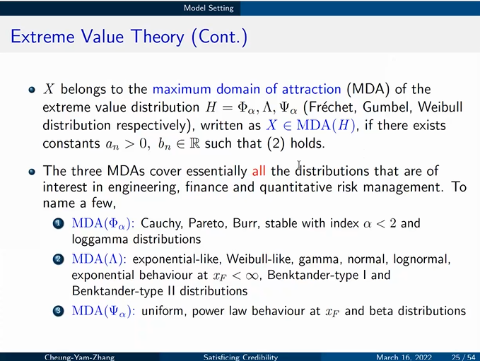 在阐述了前人研究成果之后,张艺赢指出所在团队的研究借助正规变化函数对随机变量X的尾部函数特征进行刻画和建模。在进行建模时需要借助Fisher-Tippet 理论,如果确定X的极值分布属于Frechet、Gumbel、Weibull分布的其中一种,则称X属于某一类极值分布的系数域,从而简化分析过程。