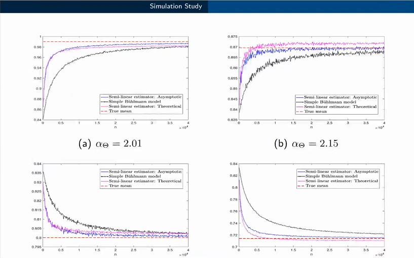 紧接着,张艺赢介绍了研究团队构建的模型,为了在实际使用和数学可处理性之间取得平衡,他们重点关注来自不同的极值分布MDA的异构风险,并结合运筹学的方法,通过提供最佳截断点的显式公式来缩小差距,直至得到渐进意义上最优的函数。张艺赢通过图示向同学们生动地展示了逼近过程。一项全面的数值研究表明,借助这个新得到的截断点,相应的半线性可信度公式优于经典的Bühlmann模型。