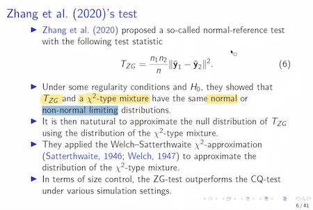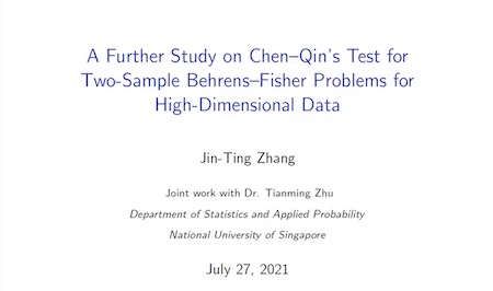 张金廷首先引进高维数据的概念,说明如果数据维数固定且远小于样本数,则可用传统的方法进行检验。而对基于两样本高维数据的Behrens-Fisher问题,传统方法失效,因而需要新的研究方法,例如Chen-Qin检验。张金廷对Chen-Qin检验做了讲解,并对复杂的公式进行简化。但Chen-Qin检验也存在一些问题,在现实应用中,可能会产生误导性的结果。